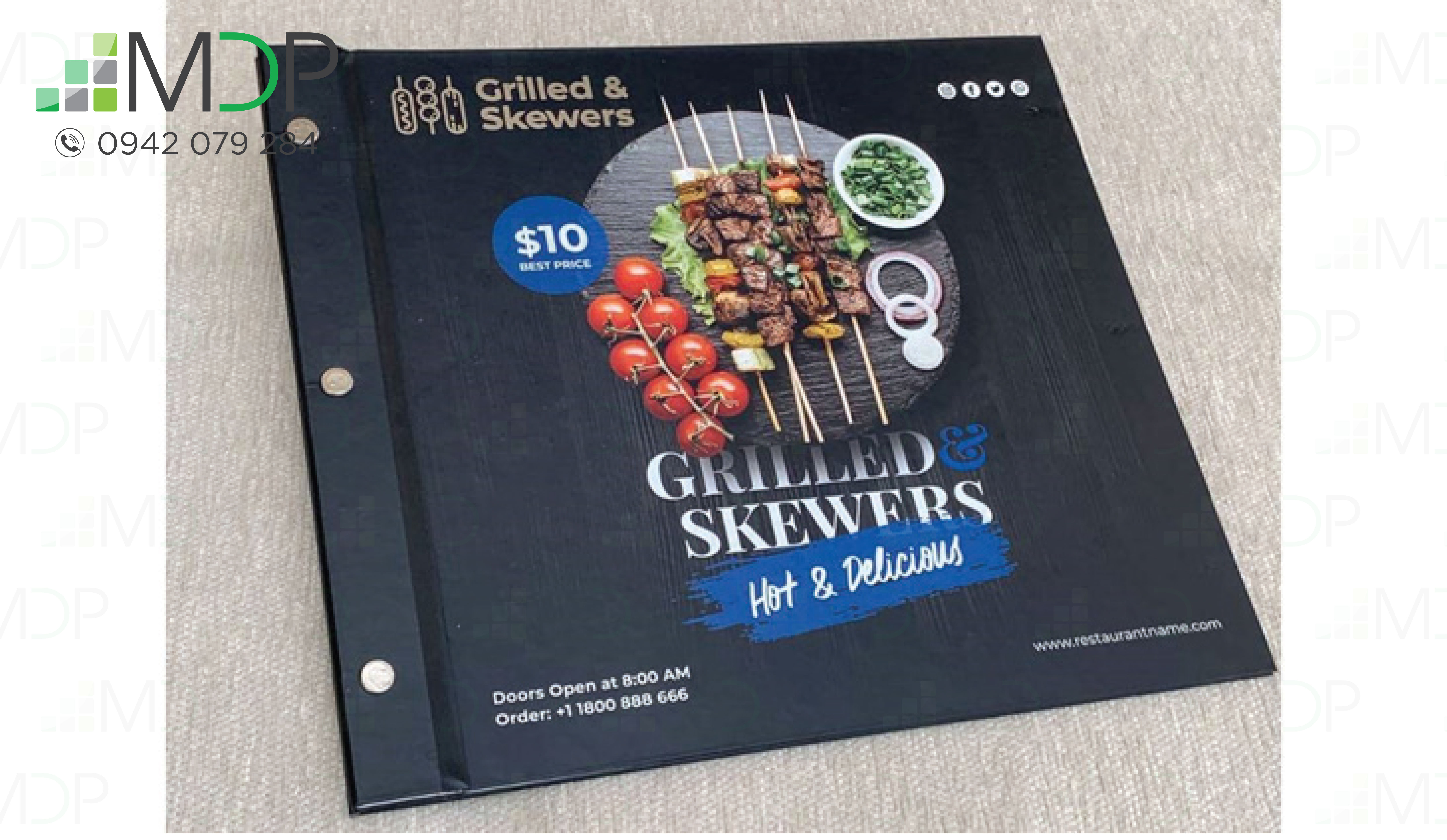 Thông thường, nếu cần in menu bìa da theo yêu cầu thì với số lượng từ 50 sẽ có giá tốt. Bạn có thể chọn nhiều loại chất liệu: bìa da PU, da simili, hoặc bìa vải giả da với hàng trăm màu sắc, hoa văn khác nhau. Thực đơn nhà hàng được thiết kế trên chất liệu da đảm bảo tính thẩm mỹ, độ bền cao. Kích thước bìa da phổ biến thường là 18x31cm, 23x31cm, 22x38cm áp dụng cho kiểu menu 2 trang. Quý khách có thể linh hoạt chọn công nghệ in phù hợp như ép chìm, ép nhũ,…