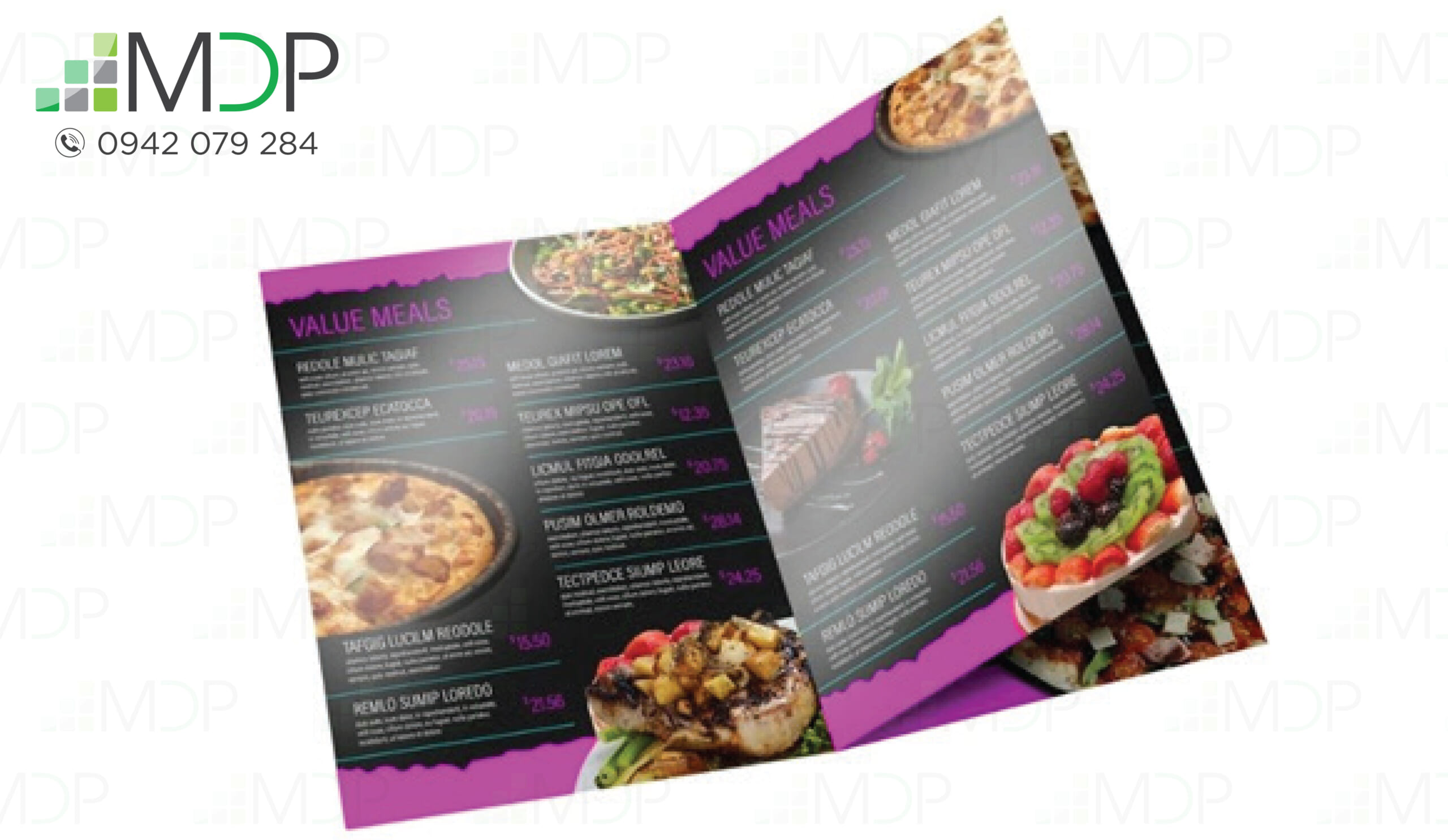 Màu sắc menu đóng vai trò quan trọng trong việc tạo ấn tượng cho khách hàng. Chúng không nên chỉ sử dụng một màu duy nhất, mà cần kết hợp các màu sắc để tạo sự nổi bật. Bạn có thể đến với Mã Đại Phúc để được tư vấn in menu tại Hà Nội phù hợp.
