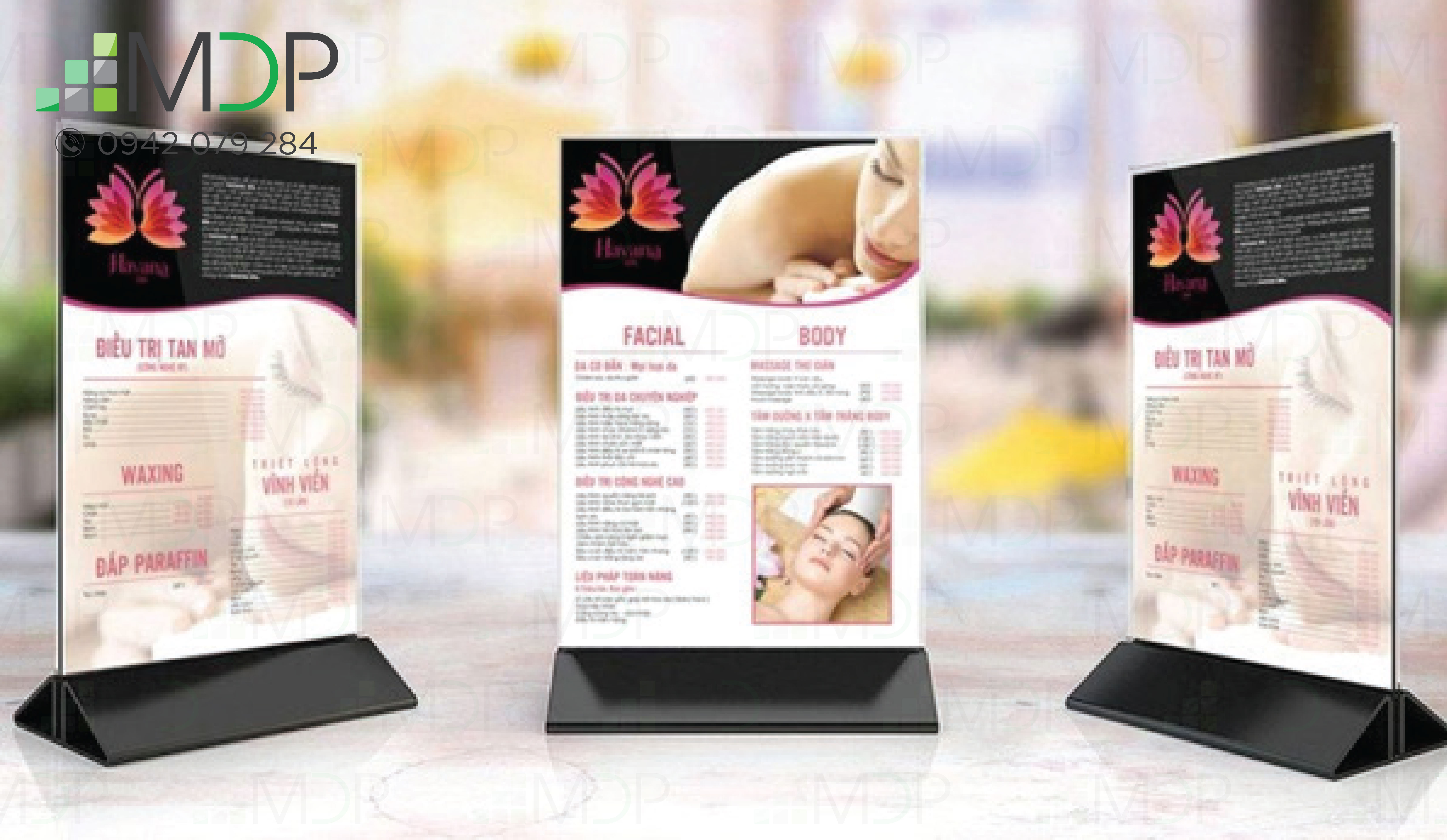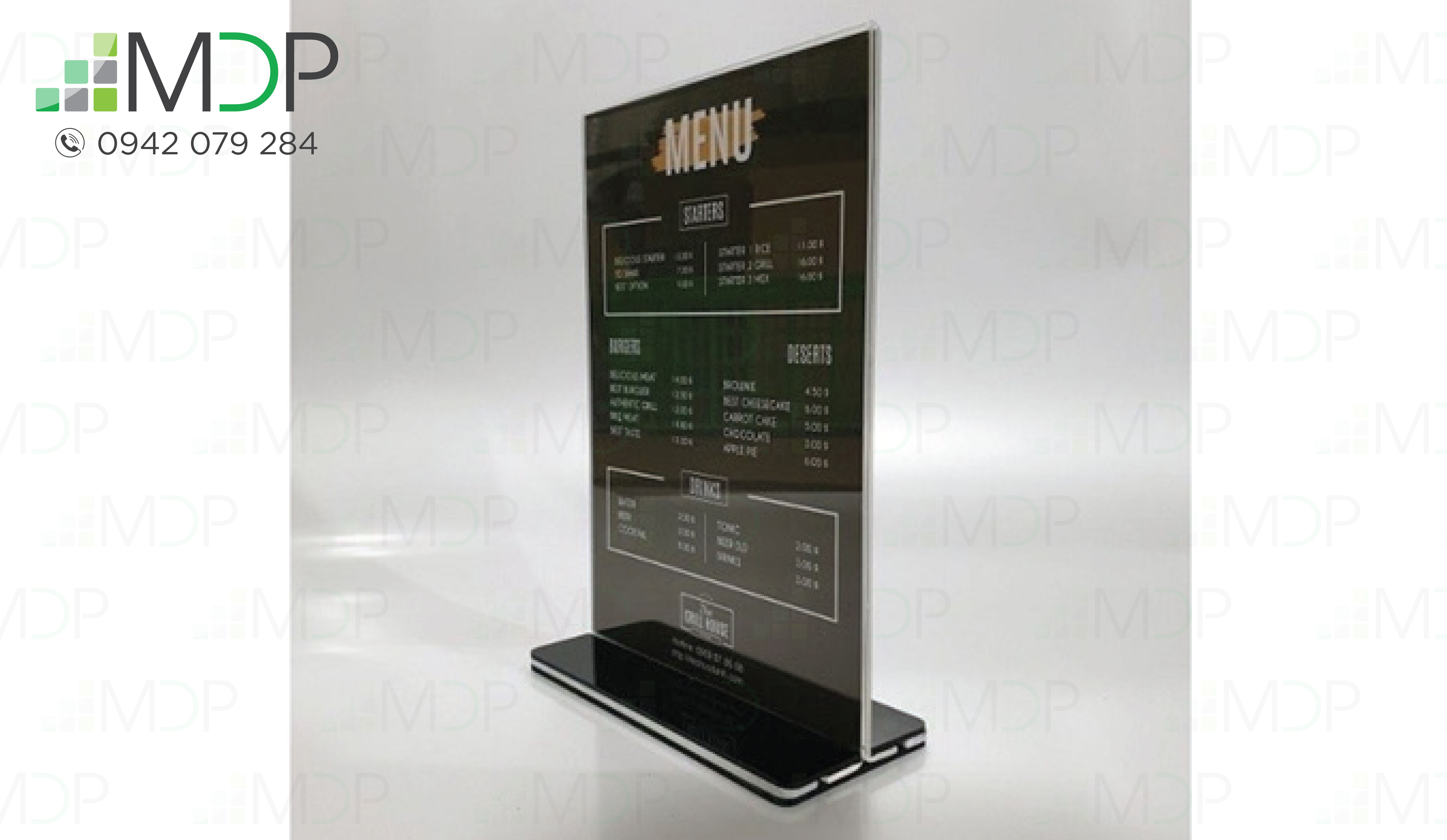 Loại menu này thường được in trên chất liệu mica, có độ bền cao, dễ lau chùi lại có khả năng chống va đập tốt. Chúng thường có thiết kế đơn giản, gọn nhẹ, mang đế sự sang trọng cho không gian quán. Phần đế và thân thiết kế rời, dễ dàng thay đổi nội dung bên trong. Loại menu này rất phổ biến, thường thấy ở các nhà hàng, quán cafe, quán trà sữa.
